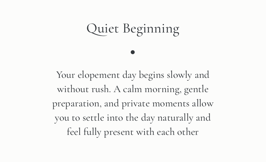 Your elopement day begins slowly and without rush. A calm morning, gentle preparation, and private moments allow you to settle into the day naturally and feel fully present with each other
