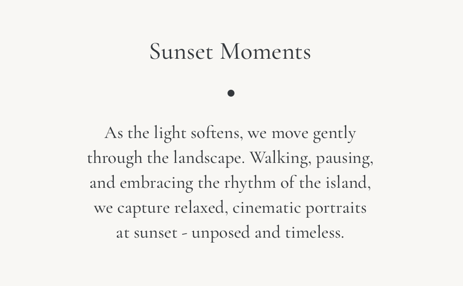 As the light softens, we move gently through the landscape. Walking, pausing, and embracing the rhythm of the island, we capture relaxed, cinematic portraits at sunset - unposed and timeless.