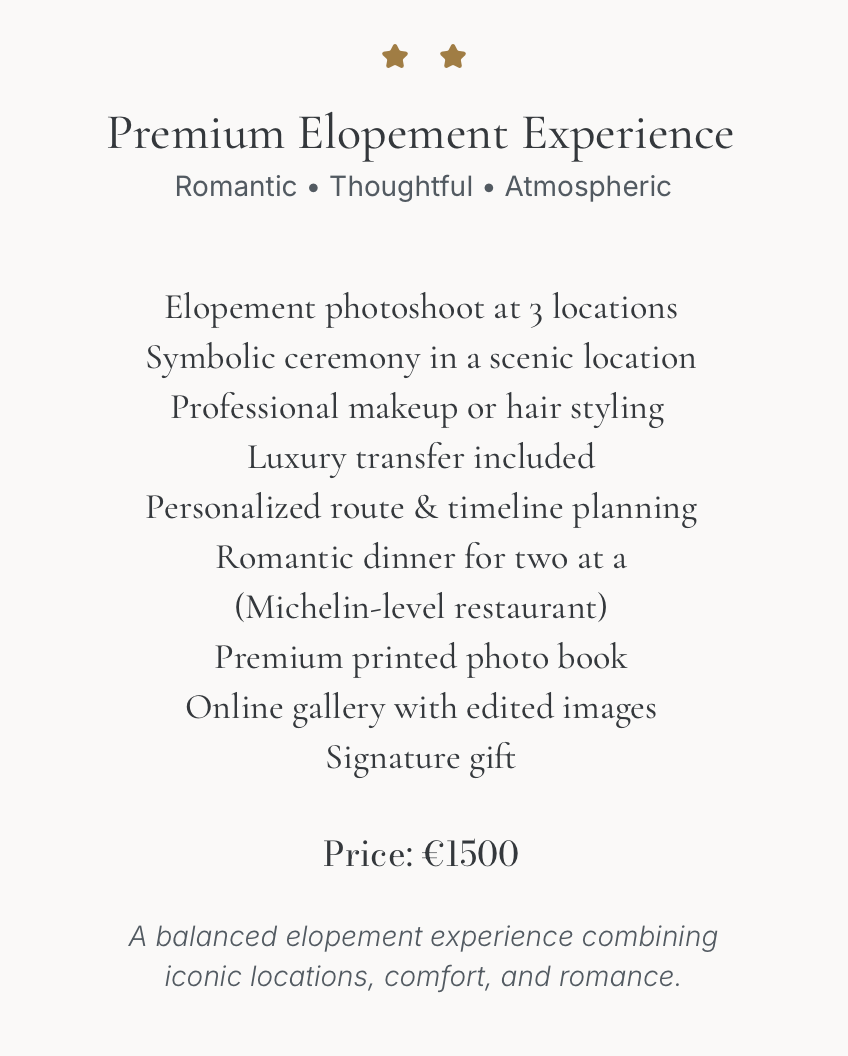A balanced elopement experience combining iconic locations, comfort, and romance.