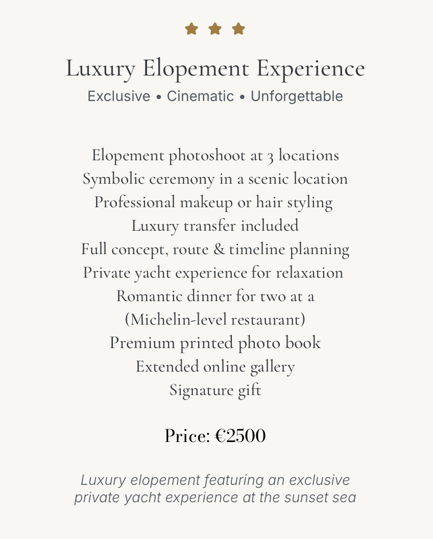Your elopement experience includes a private transfer in a premium-class vehicle, offering comfort, discretion, and a sense of ease throughout the day. From your hotel or villa to the selected location, the journey flows quietly and effortlessly - allowing the experience to unfold without interruption.