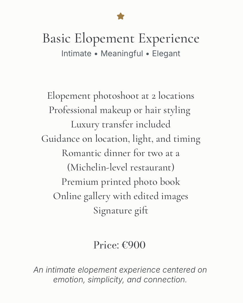 A private elopement experience designed for couples who value intimacy, simplicity, and connection. From location selection to gentle ceremony guidance and photography, everything is thoughtfully organized so your day flows naturally - calm, meaningful, and unhurried.