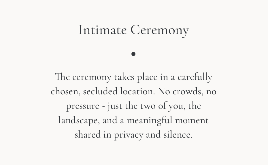 The ceremony takes place in a carefully chosen, secluded location. No crowds, no pressure - just the two of you, the landscape, and a meaningful moment shared in privacy and silence.