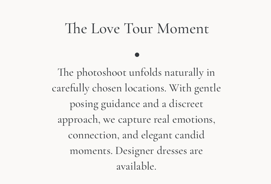 The photoshoot unfolds naturally in carefully chosen locations. With gentle posing guidance and a discreet approach, we capture real emotions, connection, and elegant candid moments. Designer dresses are available.