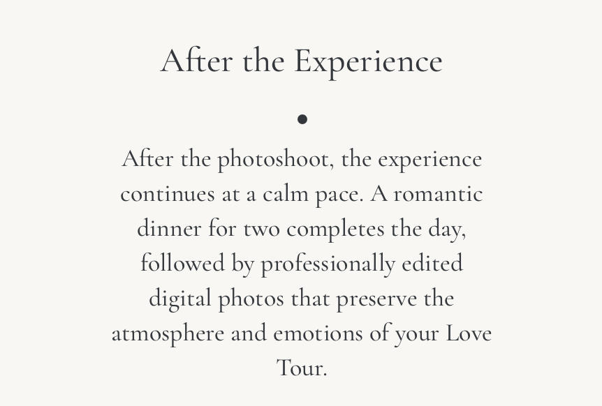 After the photoshoot, the experience continues at a calm pace. A romantic dinner for two completes the day, followed by professionally edited digital photos that preserve the atmosphere and emotions of your Love Tour.