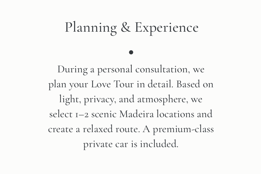 During a personal consultation, we plan your Love Tour in detail. Based on light, privacy, and atmosphere, we select 1–2 scenic Madeira locations and create a relaxed route. A premium-class private car is included.