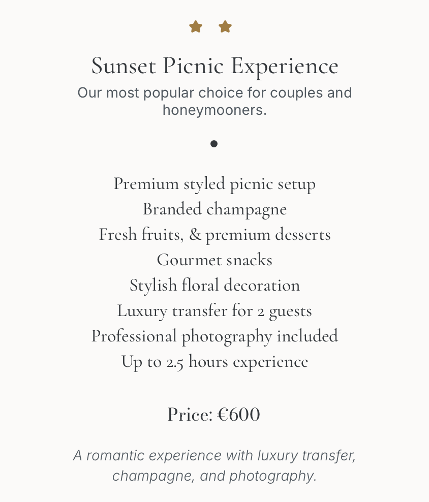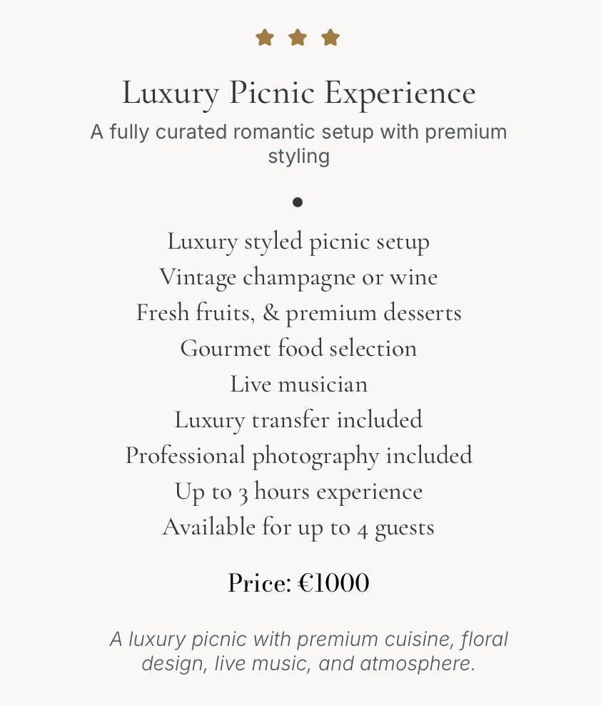 Each picnic takes place in a carefully selected location offering privacy, natural beauty, and soft light. Every setting is chosen to complement the atmosphere and elevate your experience.
